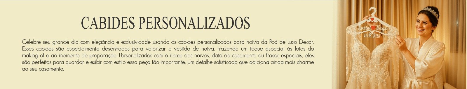 Celebre seu grande dia com elegância e exclusividade usando os cabides personalizados para noiva da Poá de Luxo Decor. Esses cabides são especialmente desenhados para valorizar o vestido de noiva, trazendo um toque especial às fotos do making of e ao momento de preparação. Personalizados com o nome dos noivos, data do casamento ou frases especiais, eles são perfeitos para guardar e exibir com estilo essa peça tão importante. Um detalhe sofisticado que adiciona ainda mais charme ao seu casamento.